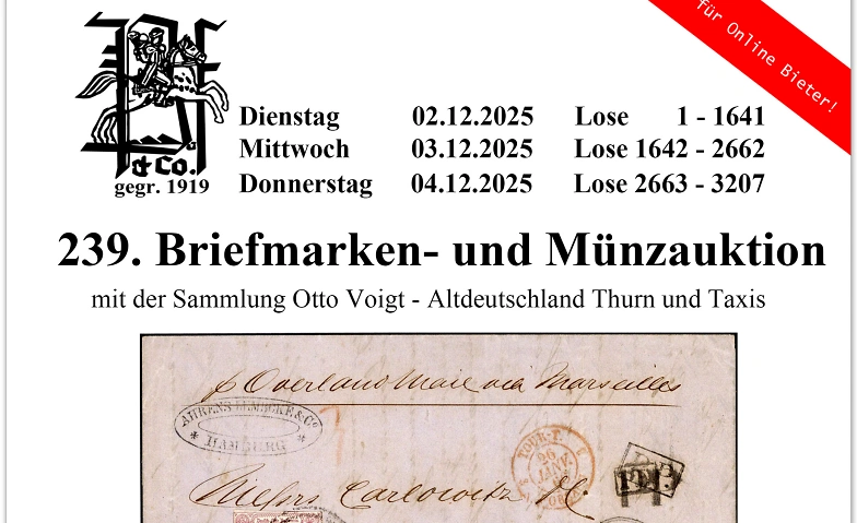 Am Dienstag, Mittwoch und Donnerstag, den 2. bis 4. Dezember 2025 findet unsere 239. Auktion für Briefmarken, Münzen und Postgeschichte mit einem attraktiven Angebot von über 3.200 Losen internationaler Philatelie und Numismatik statt.