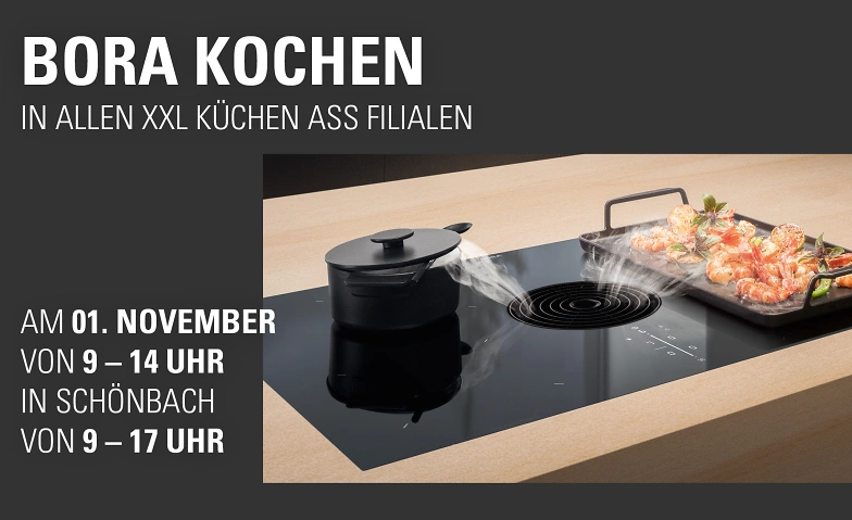 Schon bald ist es wieder soweit: Am Samstag, den 01. November öffnen wir wieder für alle BORA Interessierten unsere Türen zum BORA live erleben Event in allen XXL KÜCHEN Filialen. Entdecke die innovativen BORA Kochfelder und Dunstabzüge für dunstfreies Kochen und probiere das BORA Prinzip selber aus. Vor Ort kannst du dich unverbindlich und in angenehmer Atmosphäre über den BORA Abzug informieren und die Geräte vor Ort im Küchenstudio unter realistischen Bedingungen testen. Bis dann!