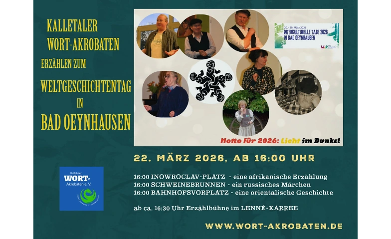 KALLETAL / BAD OEYNHAUSEN – Wenn Märchenerzähler auf die Straße gehen, werden Grenzen unsichtbar. Unter dem diesjährigen Welt-Motto „Licht in der Dunkelheit“ präsentieren die Kalletaler Wortakrobaten e. V. am 22. März die jahrhundertealte Tradition des freien mündlichen Erzählens in der Innenstadt von Bad Oeynhausen.