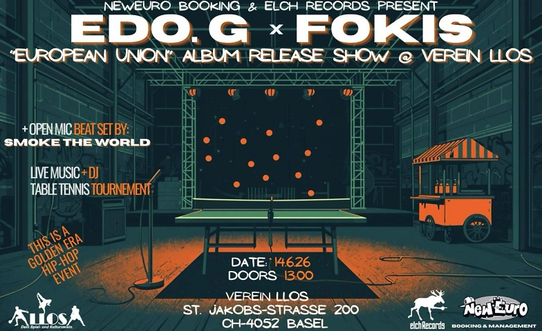 ...NewEuro Booking & Elch Records present the "European Union" Album Release Show — the joint project from legendary Boston MC EDO.G and Fokis (NYC). This is golden era hip-hop, live and direct in Basel.