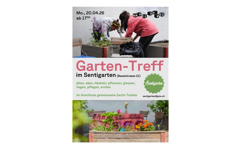 Der Sentigarten an der Baselstrasse 21 ist unsere grüne Oase der Begegnung, Mitgestaltung und Entspannung. Lust mitzumachen? Wir treffen uns ab 17 Uhr im Sentigarten um gemeinsam zu jäten, säen, häckeln, pflanzen, hegen und pflegen. Im Anschluss teilen wir ein Znacht aus selbst Mitgebrachtem. Einfach kommen oder Kontakt aufnehmen: sentigarten@gmx.ch.