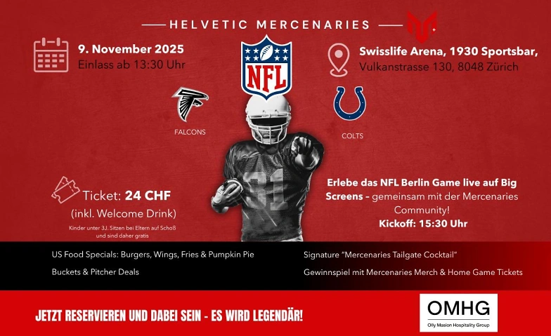 Am 9. November 2025 verwandelt sich die 1930 Sportsbar in Zürich in die ultimative Football-Arena. Sei dabei, wenn die Helvetic Mercenaries gemeinsam mit ihren Fans das NFL Berlin Game auf den Big Screens feiern – mit echtem US-Feeling, starker Community und exklusivem Hospitality-Angebot.