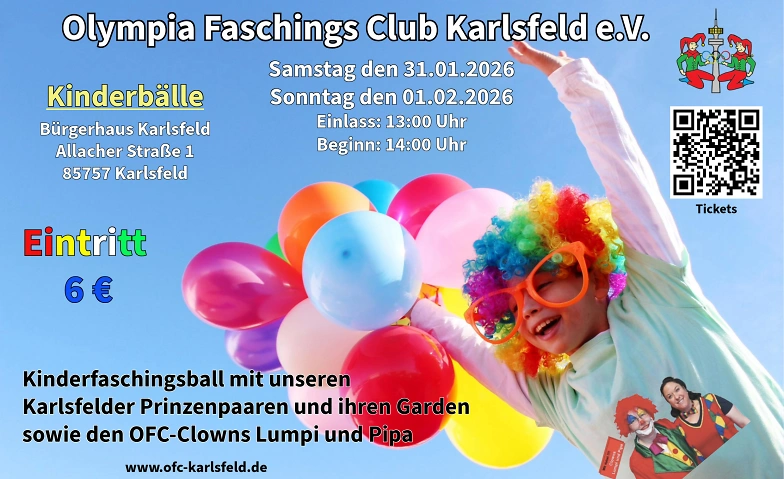 Der Olympia-Faschings-Club Kalrsfeld bei München e.V. lädt ein zum Kinderfaschingsball mit unseren Karlsfelder Prinzenpaaren und ihren Garden sowie den OFC-Clowns Lumpi und Pipa