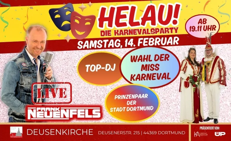 Liebe Gäste, es gibt gute und weniger gute Tage. Heute ist ein weniger guter Tag 😢. Soeben erreichte uns die Nachricht, dass die Veranstaltung "HELAU! - Die Karnevalsparty" am 14.02.2026, seitens des Vorstands der DeusenKirche, leider absagt werden muss. Grund hierfür ist ein heute festgestellter Schaden an der Oberdecke der DeusenKirche. Da die Sicherheit der Gäste oberste Priorität bei der Durchführung der Veranstaltungen hat, wurde die DeusenKirche, mit sofortiger Wirkung, bis zur erneuten Freigabe der Veranstaltungsfläche, gesperrt. Hier der offizielle Wortlaut der Erklärung seitens des Vorstands der DeusenKirche. Tickets können bei den Vorverkaufsstellen zurückgegeben werden.