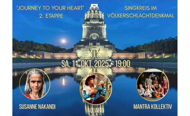 Die zweite Etappe im Leipziger Völkerschlachtdenkmal wird von NAKANDI, AQUARIO  und dem MANTRA KOLLEKTIV  zum tragen gebracht,worauf ich mich schon sehr freue.Journey to your Heart - ist ein Tagesfestival ,wo gemeinsam herzöffnende Lieder gesungen werden. Mit dieser Reise möchte ich eine besondere Gemeinschaft zum wachsen bringen. Diese besondere Energie darf in die Welt getragen werden. Es wird eine Reise durch verschiedene Locations in Leipzig sein. Dazu gehören der Kupfersaal,das Gasometer, die Peterskirche und die Kongresshalle am Zoo , um nur einige zu nennen. Wichtig ist noch zu wissen,das es nur eine BEGRENZTE ANZAHL von TICKETS geben wird. Auch wenn es eine Abendkasse geben wird,ist eine Karte im Vorverkauf zu kaufen sinnvoll und wertschätzend gegenüber den Künstlerinnen. Sollte es Dir finanziell nicht möglich sein,eine Karte zu kaufen,so sschreibe mir persönlich bzw rufe mich an.