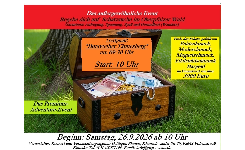 Begeben Sie sich ins Abenteuer und auf Schatzsuche im Oberpfälzer Wald. Im Waldbereich zwischen Vohenstrauß, Tännesberg, Teunz und Moosbach,befindet sich irgendwo eine Schatztruhe mit folgendem Inhalt: Echtschmuck, Modeschmuck, Edelstahlschmuck, Magnetschmuck und Bargeld im Gesamtwert von 3000 Euro.