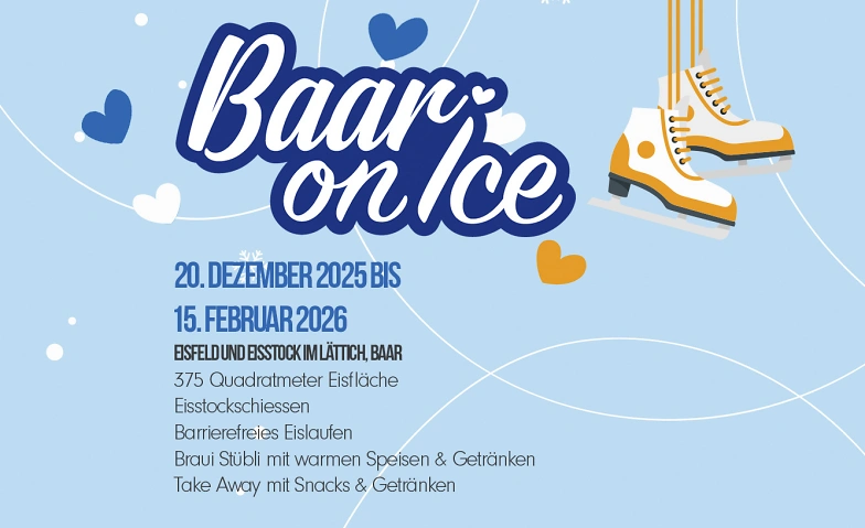 Vom 20.12.2025 bis 15.02.2026 feiert das Baar on Ice seine Premiere im Lättich Baar und bringt winterlichen Spass für Gross und Klein. Auf 375 m² Eisfläche erwartet dich ein abwechslungsreiches Programm: gemütliches Schlittschuhlaufen, spannender Hockeycup und gesellige Matches auf der Eisstockbahn.