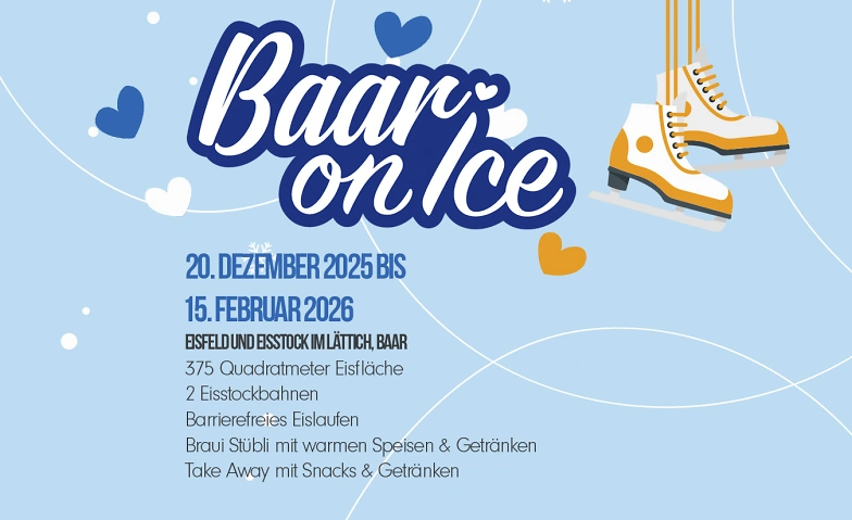 Vom 20.12.2025 bis 15.02.2026 feiert das Baar on Ice seine Premiere im Lättich Baar und bringt winterlichen Spass für Gross und Klein. Auf 375 m² Eisfläche erwartet dich ein abwechslungsreiches Programm: gemütliches Schlittschuhlaufen, spannender Hockeycup und gesellige Matches auf den Eisstockbahnen.