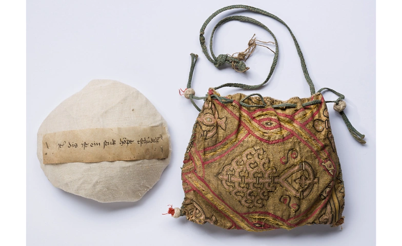 Credits: Mittelalterlicher Beutel mit dazugehöriger Reliquie aus Inwil, Ordinariat des Bistums Basel, Inv. Nr. FB 639. © Abegg-Stiftung (Foto: Christoph von Viràg)