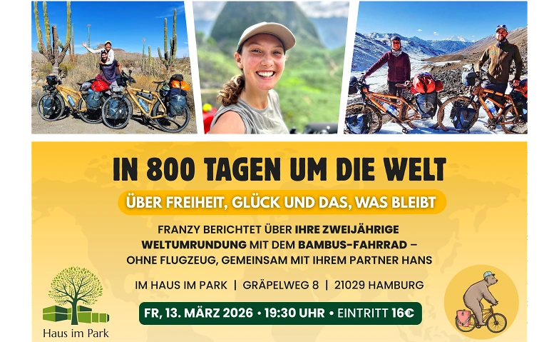 Franzy berichtet von einer zweijährigen Weltumrundung mit dem Fahrrad ohne Flugzeug. Gemeinsam mit ihrem Partner Hans war sie überwiegend mit dem Zelt unterwegs und reiste durch rund 40 Länder. Sie spricht über die Erlebnisse auf ihrer Route, über Freiheit, Glück und die Frage, was von einer langen Reise bleibt, wenn der Alltag wieder beginnt. Der Abend verbindet Eindrücke dieser Reise mit den Höhen und Tiefen, die entstehen, wenn man sich auf ein außergewöhnliches Abenteuer begibt.
