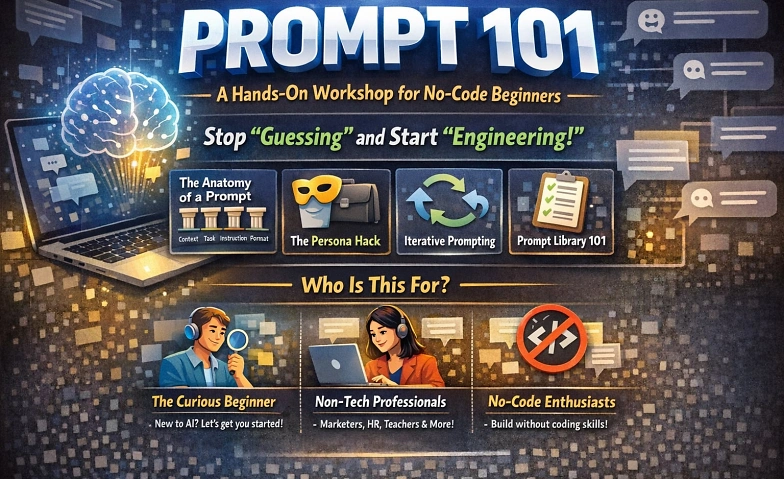 Join us for Prompt 101, a beginner-friendly, zero-code workshop designed to turn you from a casual user into a power pro. Whether you want to automate your daily tasks, write better emails, or build a side project, it all starts with the perfect prompt.