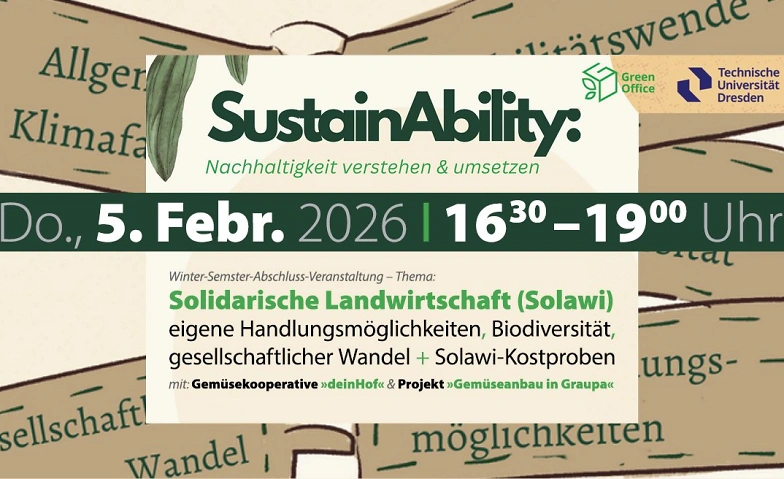 Einladung zur Winter-Semster-Abschluss-Veranstaltung der TU-Dresden-Veranstaltungsreihe »SustainAbility: Nachhaltigkeit verstehen und umsetzen« ... in der Südvorstadt, auf dem Campus der TU, George-Bähr-Str. 3, Mollier-Bau, Raum 213 (MOL/213/H), nahe Nürnberger Platz oder online und auch zum Nachhören ... in Kooperation mit Solawi-Organisationen aus der Region Radebeul, Dresden, Pirna.