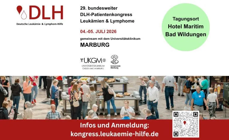 Die Deutsche Leukämie- & Lymphom-Hilfe veranstaltet ihren diesjährigen DLH-Patientenkongress am 4.-5. Juli in Kooperation mit dem Universitätsklinikum Marburg. Das DLH-Team lädt Erwachsene mit Blutkrebserkrankungen, Angehörige und alle Interessierten herzlich in das Hotel Maritim in Bad Wildungen ein.