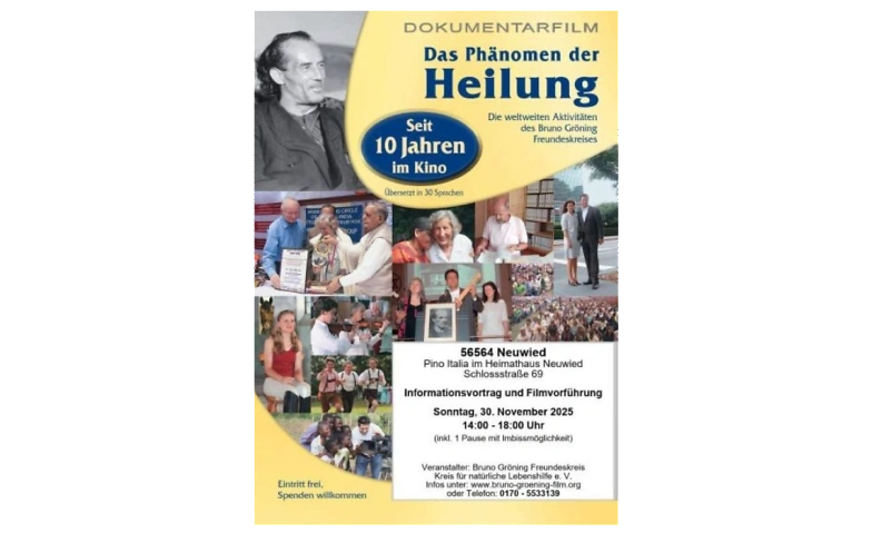 Dokumentarfilm Bruno Gröning "Das Phänomen der Heilung" Pino Italia im Heimathaus Neuwied, Schlossstraße 69, 56564 Neuwied Tickets