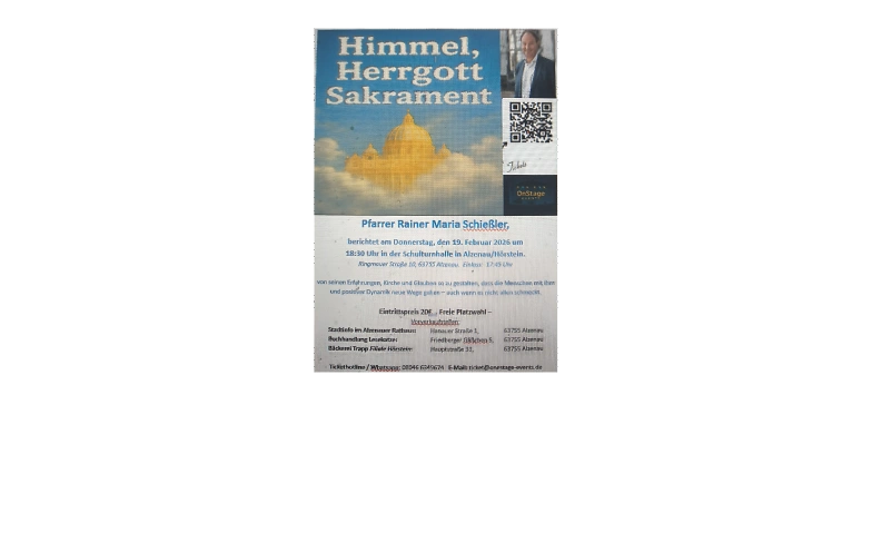 Pfarrer Rainer Maria Schießler berichtet über seine positiven Erfahrungen, auch im Jahr 2026 Menschenfischer zu sein und auf seine ganz persönliche Art und Weise den Glauben in den Herzen der Menschen zu entflammen und am Brennen zu halten. Pfarrer Schießler lebt und wirkt in der Pfarrgemeinde St. Maximilian in München. Bekannt wurde er durch sein Buch "Himmel, Herrgott, Sakrament". Das Bayerische Fernsehen widmete ihm unter gleichem Titel eine eigene Serie mit 6 Teilen.