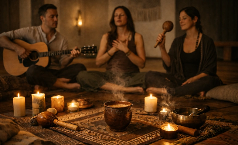 Tauche ein in einen heilsamen Raum aus zeremoniellem Kakao, Gesang und Klang – getragen von Gemeinschaft, Achtsamkeit und spiritueller Tiefe.