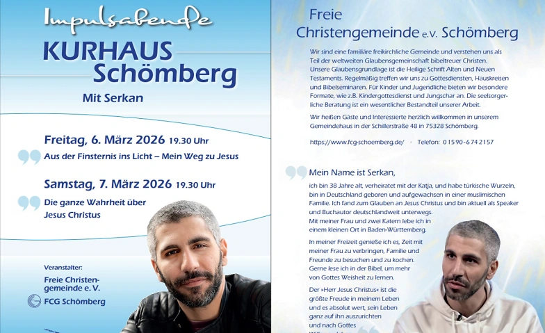 Als Freie Christengemeinde e.V. Schömberg veranstalten wir regelmäßig Vorträge in Schömberg und laden ein zu den Impulsabenden mit SERKAN.