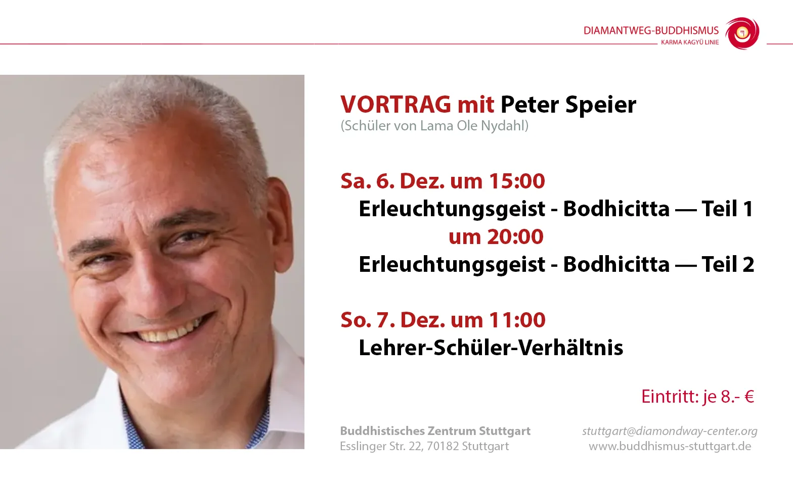 Vorträge mit Peter Speier | Sonntag, 07.12.2025, 11:00 Uhr | Buddhistisches Zentrum Stuttgart der Karmy Kagyü Linie, 70182 Stuttgart, DE | Infos | |
