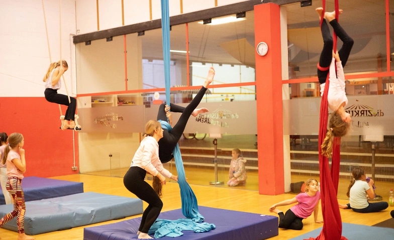 Die Kinder lernen verschiedene Disziplinen kennen – aus den Bereichen Zirkus total und Luftakrobatik. Sie dürfen ausprobieren, entdecken und erste Lieblingsbereiche finden.