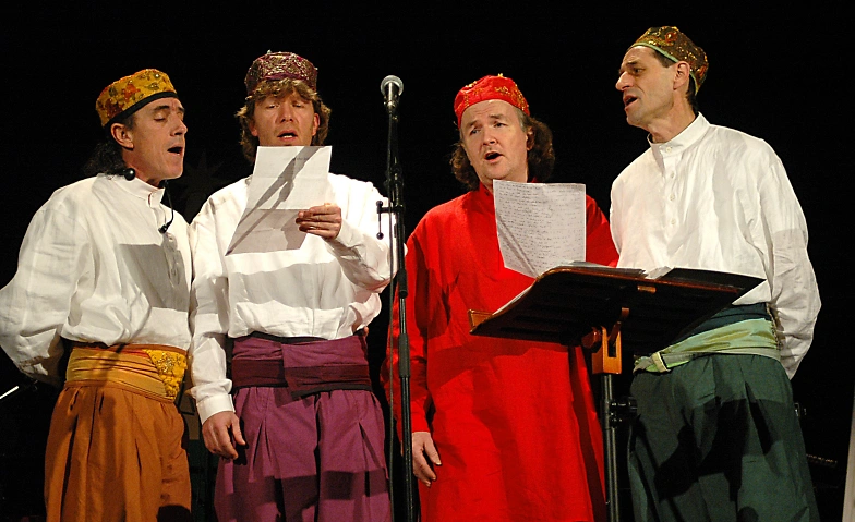 Gerhard Schöne ist ein Meister darin, dass was sein Publikum so an ihm liebt, mit immer neuen Ideen zu beleben. Märchenhaft orientalisch gekleidet, mit bestickten Kappen und verzierten Gürteln, weiten Hosen und Stehkragen- Hemden kommen die Musiker daher.