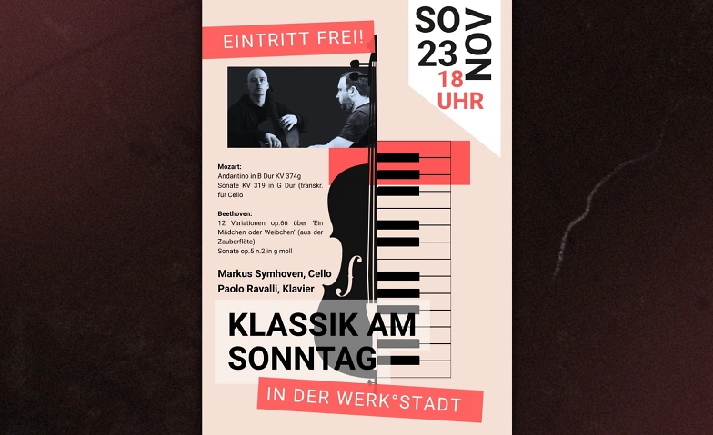 Dann kommt am 23. November 2025 um 18:00 Uhr zur Veranstaltung "Klassik am Sonntag" in die WERK°STADT. Das Duo, Markus Symhoven und Paolo Ravalli, verzaubern euch mit Stücken von Mozart und Beethoven auf dem Cello und dem Piano. Kommt vorbei, schließt die Augen und lasst euch von der Musik tragen. Wir freuen uns auf einen tollen Abend, der mit viel Leichtigkeit den Alltag für einen kurzen Moment vergessen lässt.