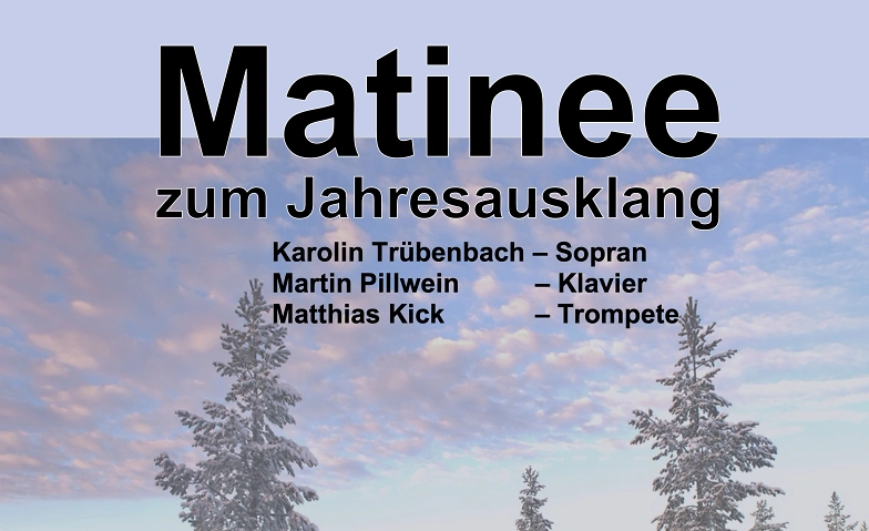 Mit Karolin Trübenbach, Sopran; Martin Pillwein, Klavier; Matthias Kick, Trompete. Erleben Sie Heiteres und Besinnliches zur Vorweihnachtszeit mit Werken von J. S. Bach, G. F. Händel, Bruno Pillwein, Gabriel Faure u. a. Die Matinee hat in Lichtenwald Tradition. Eine schöne Einstimmung auf Weihnachten und auf den bevorstehenden Jahreswechsel. Matthias Kicke mit seiner Trompete, heißt alle aus Nah und fern vom Balkon aus kurz nach 11:30 Uhr herzlich willkommen.