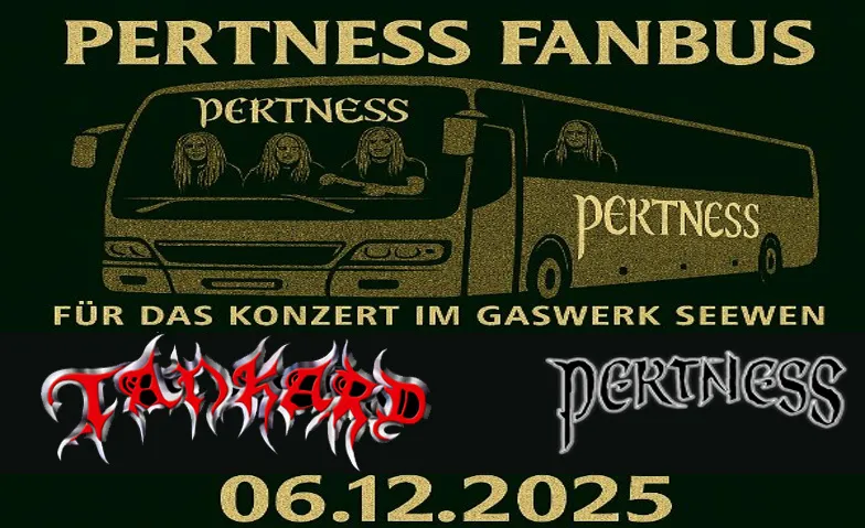 Wir fahren gemeinsam mit dem Fan-Bus vom Berner Oberland zum Konzert von Tankard und Pertness ins Gaswerk Seewen – und nach der Show natürlich wieder zurück.