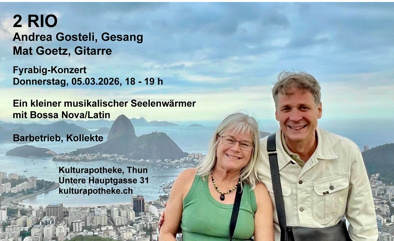 Das Duo '2 RIO' mit Andrea Gosteli, Gesang, und Mat Goetz, Gitarre, interpretieren Songs aus Brasilien und anderen nahen Gefilden. Ein kleiner musikalischer Seelenwärmer am Fyrabig.