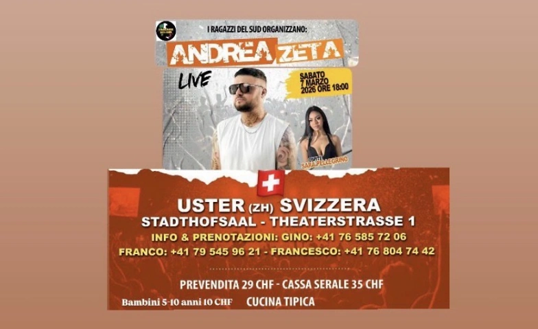 Sabato 7 marzo 2026, il Stadthofsaal di Uster ospiterà Andrea Z, protagonista assoluto della serata, per uno show imperdibile.