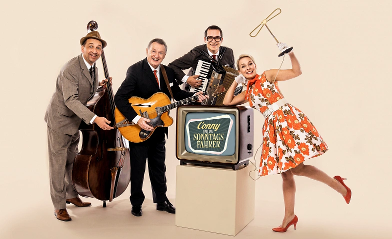 Shows wie „Dalli Dalli“, Ratespiele wie „Was bin ich“ oder Lehrstunden mit „Der siebte Sinn“ prägten die TV-Landschaft auf nur drei verfügbaren Sendern. Die Musik war stets fester Bestandteil, egal von Freddy Quinns „Junge komm bald wieder“, Caterina Valentes „Spiel noch einmal für mich, Habanero“ oder Trude Herr´s „Ich will keine Schokolade“. Noch heute können diese Hits begeistern und wenn Andrea Graf alias „Conny“ mit ihren Sonntagsfahrern (Rainer Heindl an der Gitarre, Thomas Stoiber mit Akkordeon und Steffen Zünkeler am Kontrabass, weitere Lieder wie „Mariandl“, „Ganz Paris träumt von der Liebe“ oder „Little Banjo Boy“ anstimmen, singt das Publikum gerne mit. Dazu flotte Sprüche, Werbespots und allerlei Klamauk, wie man es von damals kennt. Was Conny und die Sonntagsfahrer ihren Zuschauern bieten, wäre früher eine „Eurovisionsshow“ gewesen, und zwar in Farbe!
