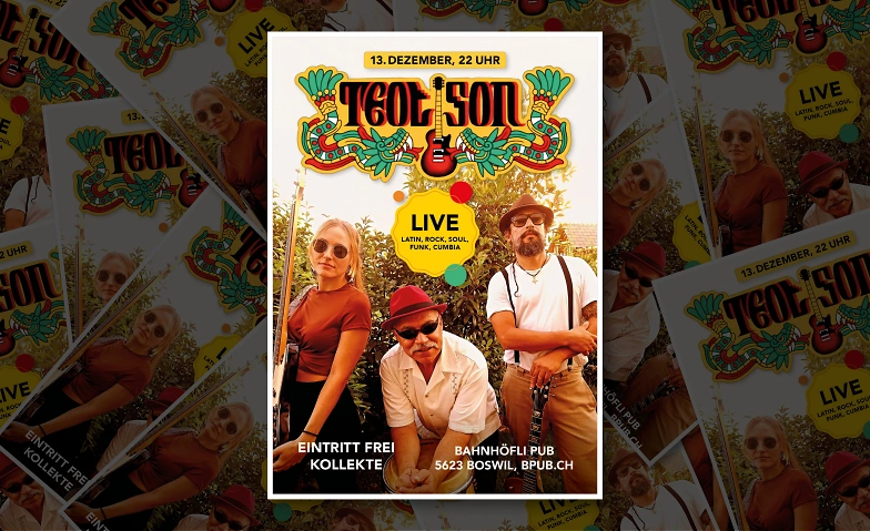 🔥 Hola Boswil! Teotlson (Mex) OTLSON bringt südländische Vibes ins Pub! Die Band, die sich an der «Get Connected» Jamsession traf, bringt das perfekte Gegenmittel für die Winterkälte mit. Einen unwiderstehlichen Live Mix aus Latin, Rock, Soul, Funk und Cumbia. Gemeinsam für eine Nacht dem Winter entfliehen und das Leben feiern! Wo: Bahnhöfli Pub, 5623 Boswil Wann: 13. Dezember, ab 22 Uhr Eintritt: Frei, Kollekte #Live #Konzert #Pub #Boswil #mexican #cumbia #chacha #santana