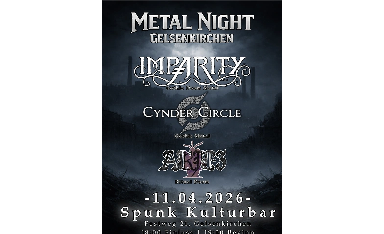 Die Metal Bands Imparity, ArieZ und Cynder Circle spielen am 11.04.2026 ab 18 Uhr in der KulturBAR Spunk in Gelsenkirchen-Ückendorf.