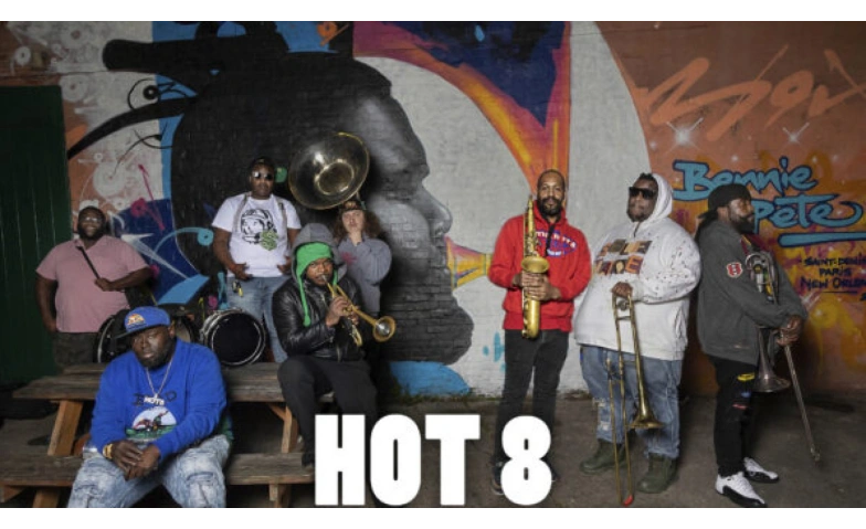 Die Hot 8 Brass Band, die sich auf das traditionelle Jazz-Erbe ihrer Heimatstadt New Orleans beruft, ist dafür bekannt, dass sie Elemente des Funk, Hip-Hop, Rap und dessen lokale Variante, den „Bounce“, in ihre Musik einfließen lässt. Das Kollektiv gewann bei den 64. jährlichen Grammy Awards 2022 für seine Mitwirkung an John Batistes „Album of The Year“, nachdem sie für ihre „The Life & Times Of… “ LP für ‘Best Regional Roots Album’ in 2013 nominiert waren.