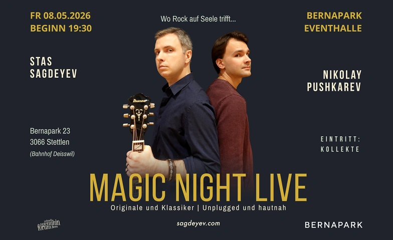 Stas Sagdeyev und Nikolay Pushkarev sprengen die Grenzen zwischen Bühne und Publikum. Vergessen Sie steife Konzertbestuhlung - hier zählt die Musik pur. Wir präsentieren eine ehrliche Mischung aus eigenen Kompositionen und neu interpretierten Rock-Hymnen: Es ist eine Reise zu den Wurzeln des Rock - unplugged und direkt.