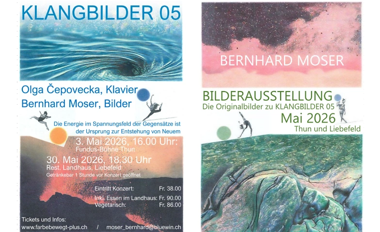Tickets zu den Klavierkonzerten "KLANGBILDER 04" von Olga Čepovecka mit Bühnenbilder von Bernhard Moser vom 3. Mai 2026 (Thun), 30. Mai 2026 (LiebefeldBern)
