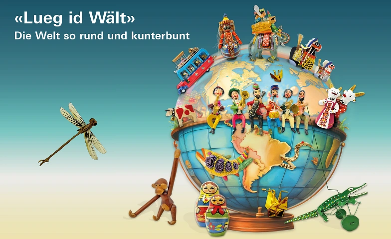 Die Ausstellung «Lueg id Wält» öffnet einen Blick in verschiedene Länder der Welt. Wer findet ein Spielzeug aus der Heimat der Eltern? Wer kennt eine der vielen Fahnen? Welche Sprachen können wir sprechen? Wie sieht mein Kinderzimmer aus und wie das von Kindern aus verschiedenen Kontinenten.