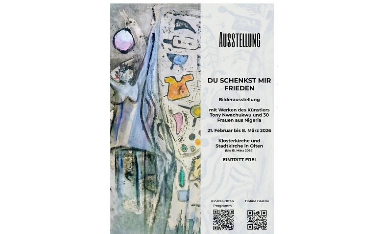 Das Werk vom nigerianischen Künstler Tony Nwachukwu und 30 Frauen aus dem Süden des Landes ist vom 21.2. - 8.3. // 15.3.26 in Kloster und Stadtkirche Olten zu Gast. Anlass ist der Weltgebetstag 2026 (WGT - Gastgeberland Nigeria). Die Frauen haben unter der Leitung des Künstlers und zum Motto des WGT "Ich will dich stärken. Komm bring mir deine Last" eigene Werke gestaltet.