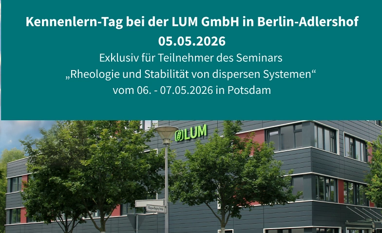 Reisen Sie gerne schon am Dienstag (05.05.2026) an und nutzen Sie den Nachmittag für einen exklusiven Kennenlern-Tag bei der LUM GmbH in Berlin-Adlershof. In entspannter Atmosphäre erhalten Sie einen praxisnahen Einblick in moderne Messtechnik und Stabilitätsanalysen für disperse Systeme – ideal, um sich optimal auf das anschließende Seminar vorzubereiten.