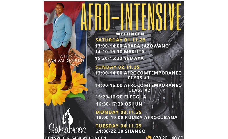 Sunday (02.11) –13:00-15:00 Afrocontemporary Classes, 15:20-16:20 Elegguá, 16:30-17:30 Oshún