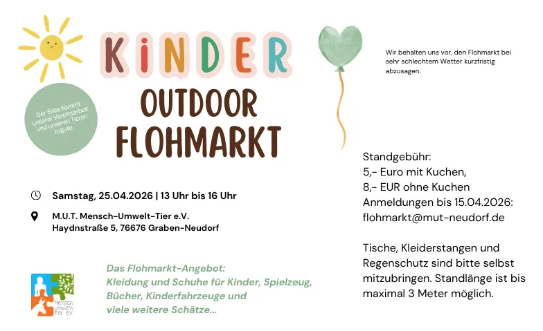 Am Samstag, den 25.04.2026, veranstaltet der M.U.T. Mensch-Umwelt-Tier e.V. seinen ersten Kindersachen-Outdoor-Flohmarkt in Graben-Neudorf.