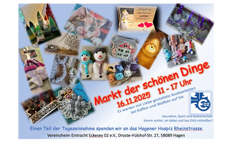 Der Verein TuS Eintracht 02 Ecksesey e.V. (Droste-Hülshoff-Str. 27, 58089 Hagen) lädt herzlich zum „Markt der schönen Dinge“ ein.
