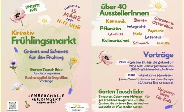 Mit über 40 AusstellerInnen aus der Region läuten die Feilbingert Landfrauen den Frühling ein. Handgemachtes aus allen denkbaren Werkstoffen- Papier & Schmuck, Genähtes & Getöpfertes, Fotografinnen und vieles mehr wartet auf die BesucherInnen. Zum Frühling gibt es kleine & große Pflanzen. Leckers aus Küche & Keller. Ein großes Kuchenbuffet der Landfrauen, Grilltes der Feuerwehr und Waffeln des Kigafös. Vorträge sind um 14.00 Uhr "Garten fit für die Zukunft" von Mirja Neff und 16.00 Uhr "Asiatische Hornisse"- von Heike Mensch, finden im Nebenraum der Halle statt. Neu ist außerdem eine Garten Tausch Ecke - Geben & Nehmen - für gut erhaltene Dinge rund um den Garten, die anderen Freude machen und nicht im Müll landen sollten. Auch finden wieder Mitmachaktionen für Kinder statt.