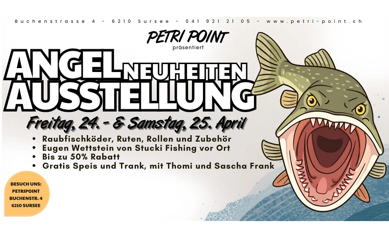 Angel-Neuheitenausstellung 2026 Tickets Angel-Neuheitenausstellung 2026 Freitag, 24.04.2026, 09:00 Uhr Petri Point, 6210 Sursee, CH Infos