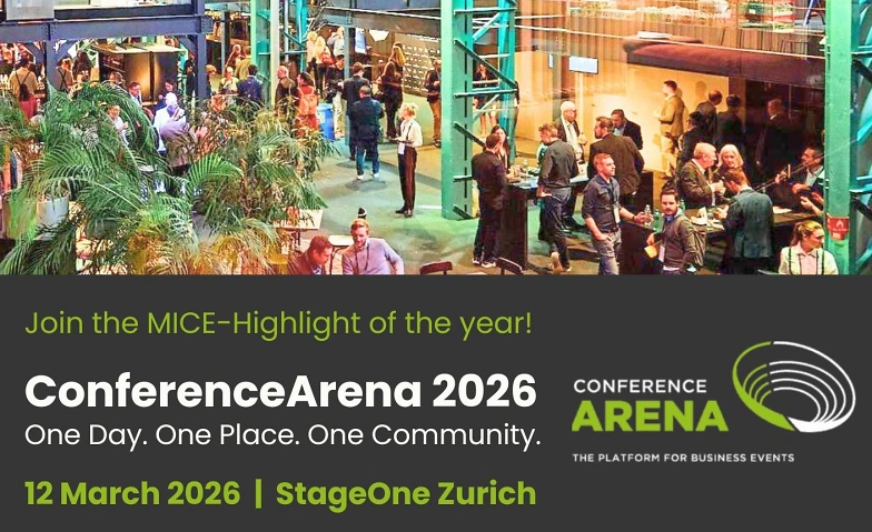 ConferenceArena is Switzerland’s platform for business events, bringing together the MICE and hospitality industry for one day in one place. On 12 March 2026, the trade show celebrates its 10th anniversary edition at StageOne Zurich, welcoming national and international exhibitors as well as decision-makers from across the industry.