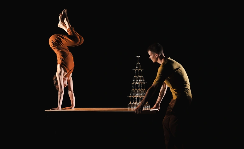 Eine Zirkusshow mit einem Jongleur, einer Handstandkünstlerin, Holzbrettern und 300 Weingläsern.