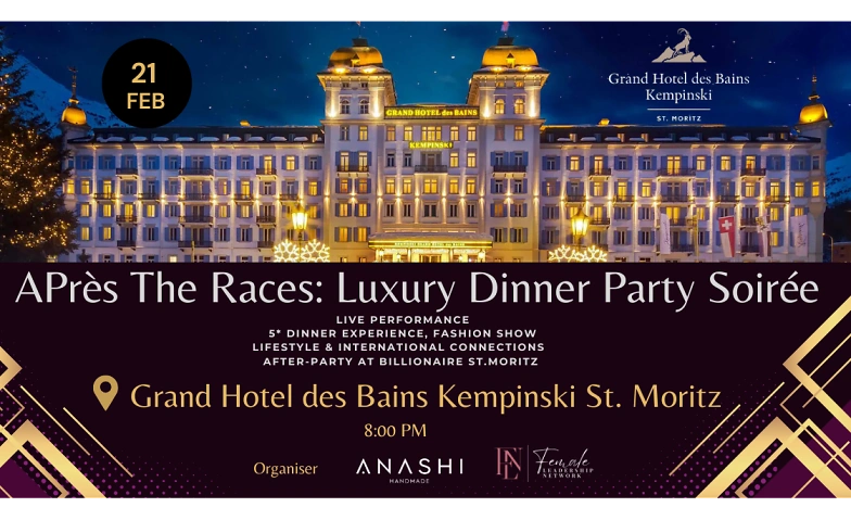 Hosted at the iconic Grand Hotel des Bains, Kempinski St. Moritz, Après The Races Luxury Dinner Soirée promises an unforgettable night set amidst snow-covered peaks, shimmering lights, and the timeless prestige of St. Moritz at its most magical.