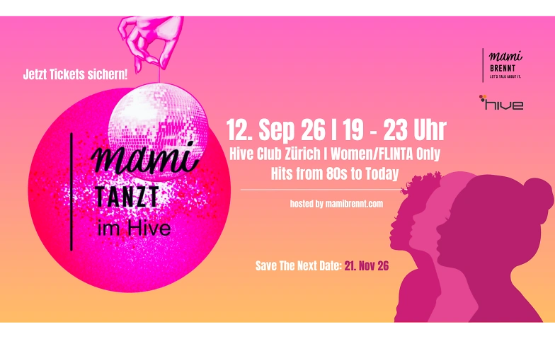 Am 12. September 2026 lädt mamibrennt.com wieder Women Only (ab 21 Jahren) zum frühen Tanzen ins HIVE! (Sorry, Jungs, ihr müsst leider draussen bleiben, zumindest bis 23 Uhr ;-))