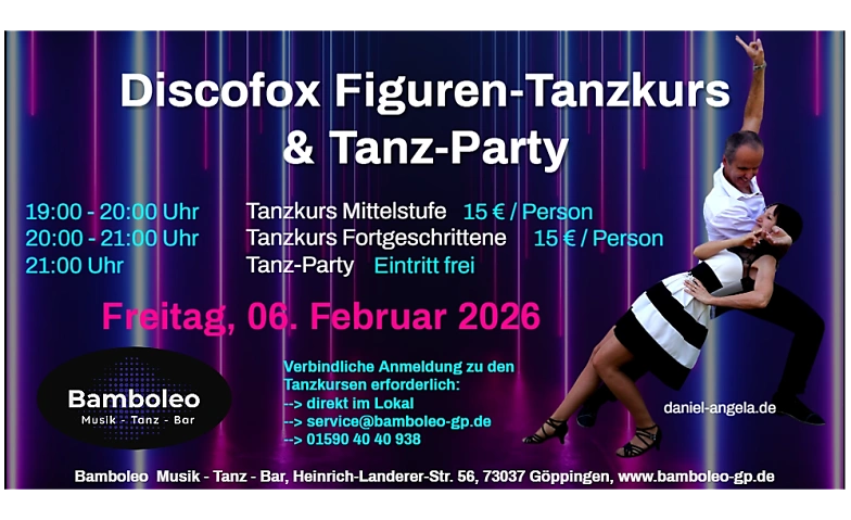 Erlebt mit uns einen mitreißenden Abend voller Tanz, Kreativität und Spaß im Bamboleo in Göppingen. Unser Discofox Figuren Tanzkurs bietet euch spannende Figurenkombis und coole Moves, die ihr direkt in der anschließenden Tanzparty umsetzen könnt.