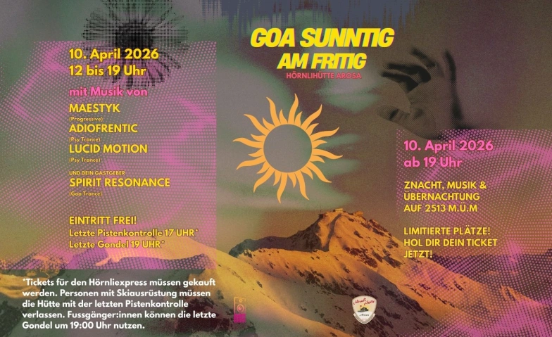Auch dieses Jahr zelebrieren wir den GOA SUNNTIG, einfach am Freitag. Am 10. April laden wir von 12:00 Uhr bis 19:00 Uhr zu einem Nachmittag auf dem Berg mit Musik & Tanz ein. Der Eintritt ist gratis, du brauchst nur dein Ticket für den Hörnliexpress. Die Bahn fährt regulär bis 16:30 Uhr und um 19:00 Uhr gibt es eine zusätzliche letzte Talfahrt. Wir freuen uns, wenn du uns auf diese Reise durch Zeit und Trance begleitest.