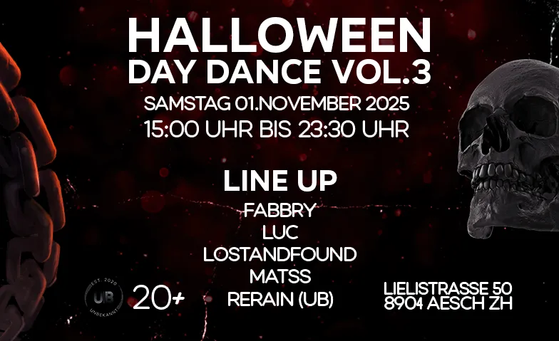 Nach bereits zwei erfolgreichen Halloween Daydance-Ausgaben in der Waldhütte Aesch ist Unbekannt Events zurück – und dieses Mal legen wir noch einen drauf! Am Samstag, 01.11.2025, feiern wir die dritte Ausgabe von unserem legendären Halloween Daydance. Die Waldhütte Aesch (Lielistrasse 50, 8904 Aesch) wird von 15:00 bis 23:30 Uhr in ein düsteres Festivalgelände verwandelt – mit packenden Beats, einzigartiger Stimmung und einer Atmosphäre, die man nur einmal im Jahr erlebt.